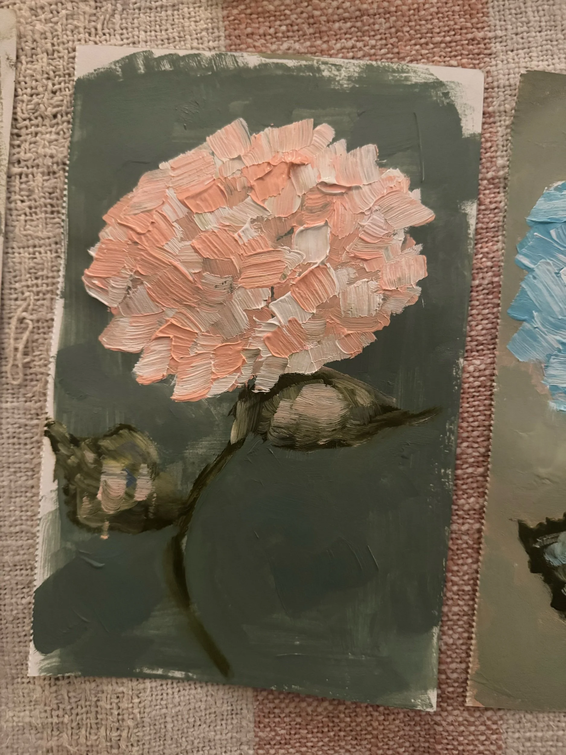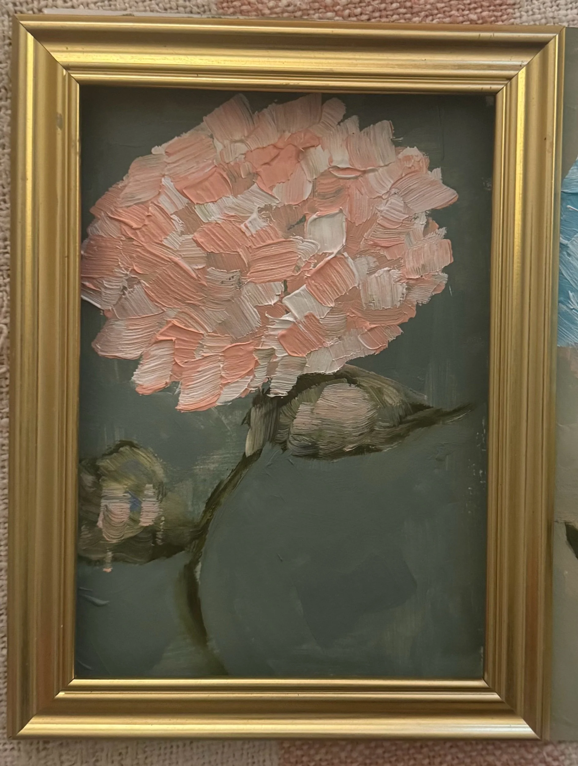 Image 1 of 2 Image 2 of 2 Pink is my fav color $25.00 5/7 oil based hydrangeas on art paper with gold frame Add To Cart Added! 5/7 oil based hydrangeas on art paper with gold frame